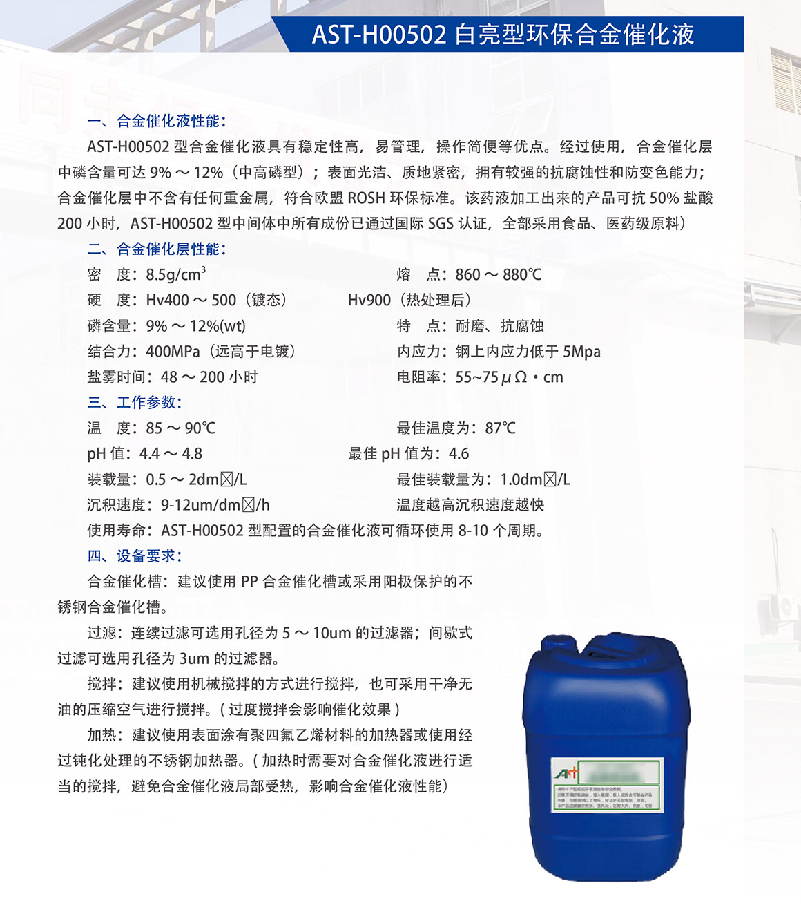 概述:AST-H00502型合金催化液具有稳定性高,易管理,操作简便等优点。经过使用,合金催化层中磷含量可达 9%~12%(中高磷型);表面光洁、质地紧密,拥有较强的抗腐蚀性和防变色能力;合金催化层中不含有任何重金属,符合欧盟 ROSH 环保标准。该药液加工出来的产品可抗 50% 盐酸200小时,AST-H00502 型中间体中所有成份已通过国际SGS 认证,全部采用食品、医药级原料)