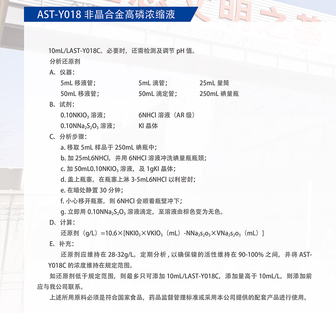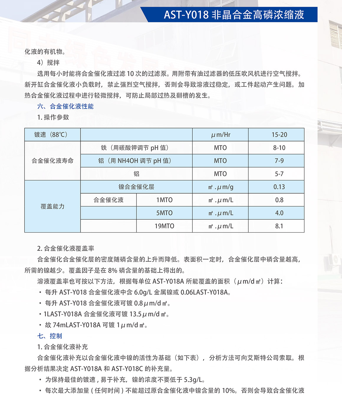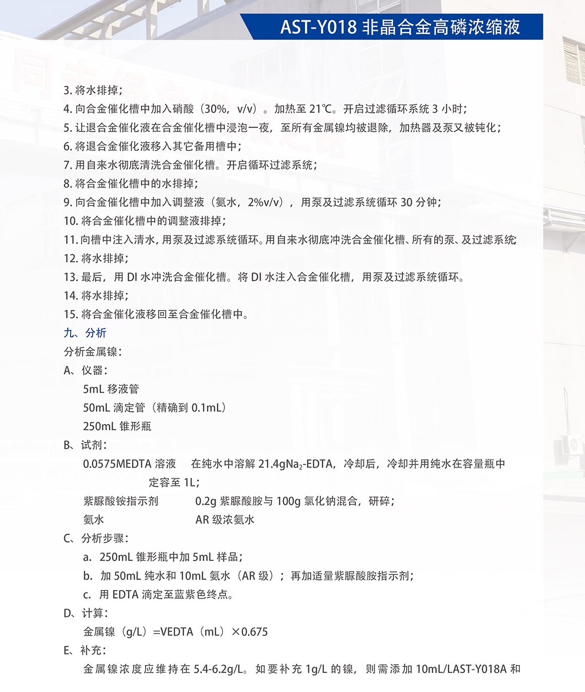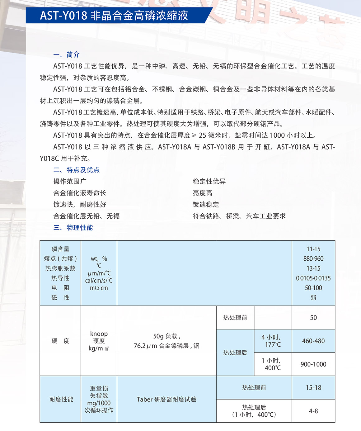 概述:AST-Y018 工艺性能优异,是一种中磷、高速、无铅、无的环保型合金催化工艺。工艺的温度稳定性强,对杂质的容忍度高。