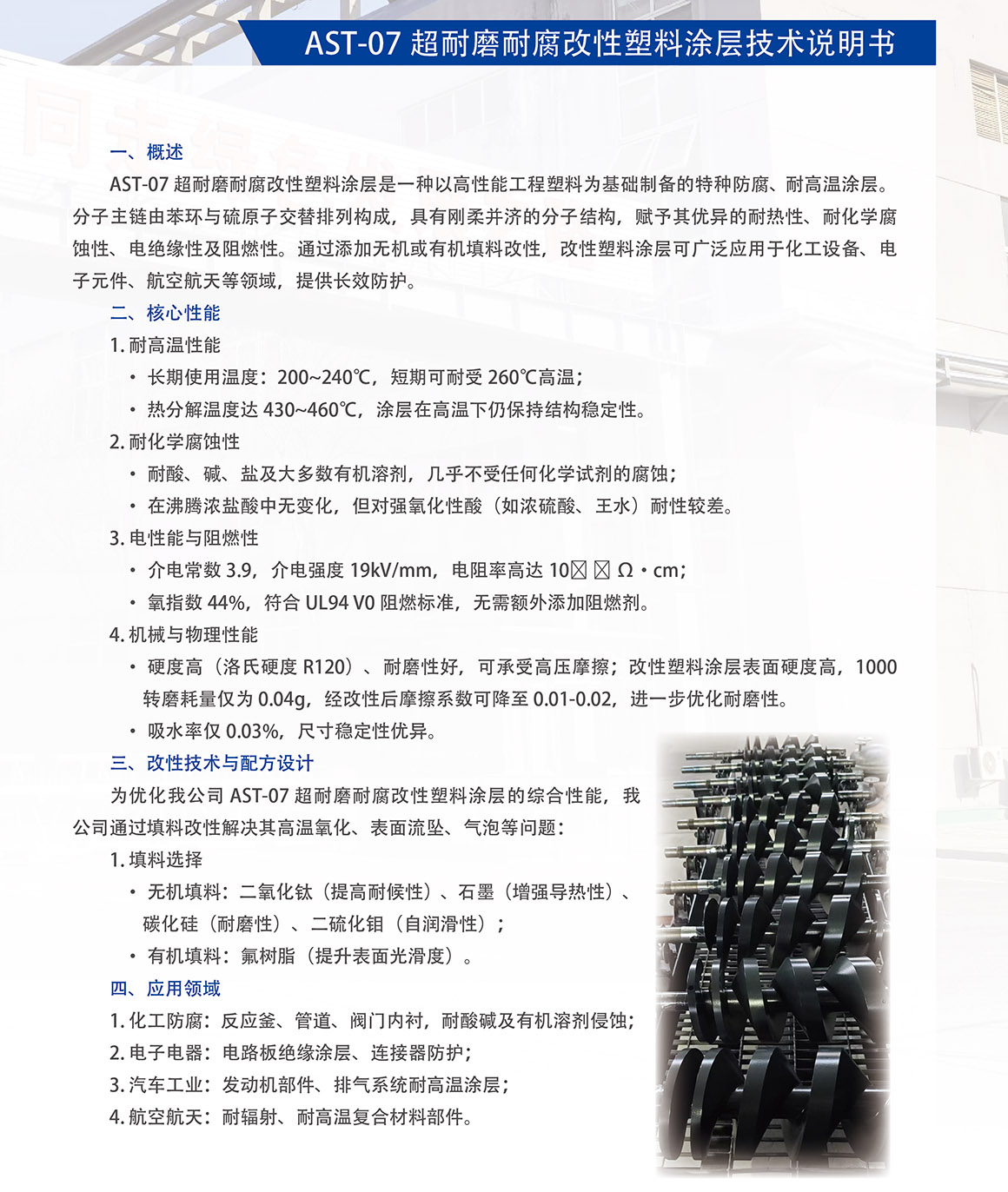 概述:AST-07 超耐磨耐腐改性塑料涂层是一种以高性能工程塑料为基础制备的特种防腐、耐高温涂层分子主链由苯环与硫原子交替排列构成,具有刚柔并济的分子结构,赋予其优异的耐热性、耐化学腐蚀性、电绝缘性及阻燃性。通过添加无机或有机填料改性,改性塑料涂层可广泛应用于化工设备、电子元件、航空航天等领域,提供长效防护。