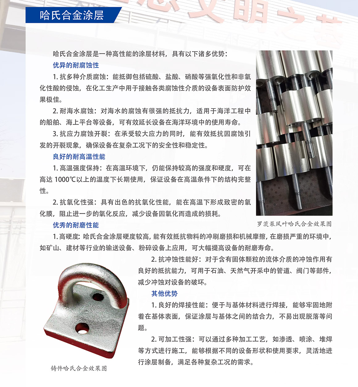 概述:哈氏合金涂层是一种高性能的涂层材料,具有以下诸多优势: 优异的耐腐蚀性 1.抗多种介质腐蚀:能抵御包括硫酸、盐酸、硝酸等强氧化性和非氧化性酸的侵蚀,在化工生产中用于接触各类腐蚀性介质的设备表面防护效果极佳。