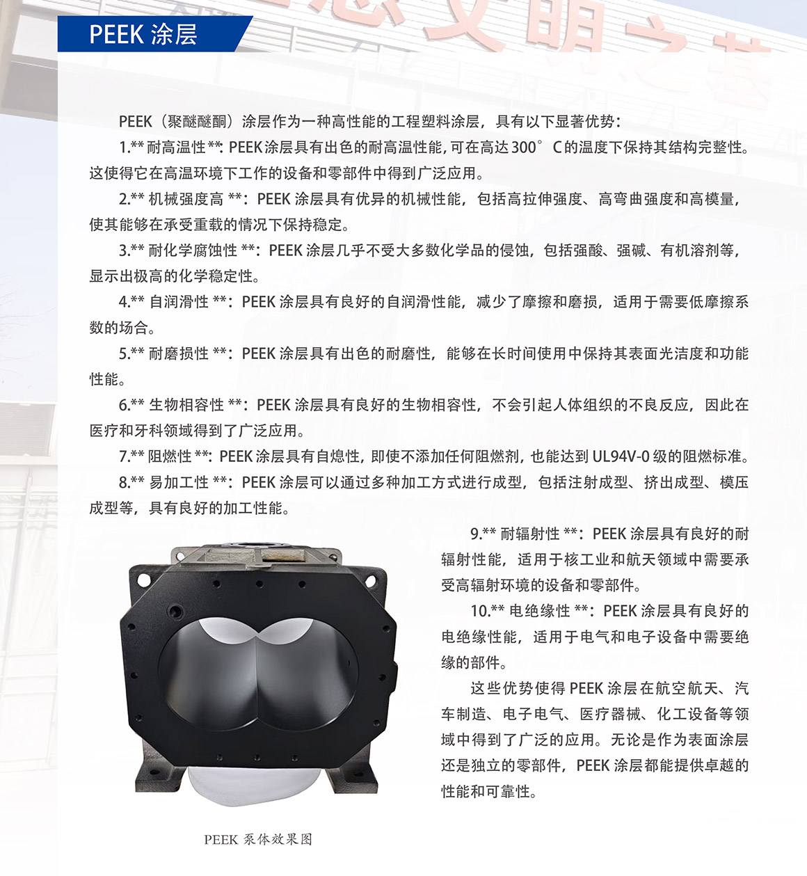 概述:PEEK(聚醚醚酮) 涂层作为一种高性能的工程塑料涂层,具有以下显著优势 1.**耐高温性** PEEK涂层具有出色的耐高温性能,可在高达300° C的温度下保持其结构完整性这使得它在高温环境下工作的设备和零部件中得到广泛应用。